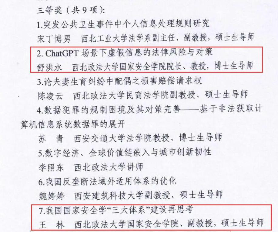 近日,陕西省法学会发布了《关于第二届“陕西省法学优秀成果奖”评选结果的通报》,我院舒洪水教授和王林副教授荣获“论文类三等奖”。其中,舒洪水教授的论文《ChatGPT场景下虚假信息的法律风险与对策》刊发在《新疆师范大学学报(哲学社会科学版)》2023年第5期,围绕应对ChatGPT场景下虚假信息可能触发的法律风险提出系统性应对之策。王林副教授的论文《我国国家安全学“三大体系”建设再思考》发表于《情报杂志》2022年第10期,围绕探索构建有中国特色的国家安全学学科体系、学术体系和话语体系提供制度框架展开深入研究。
